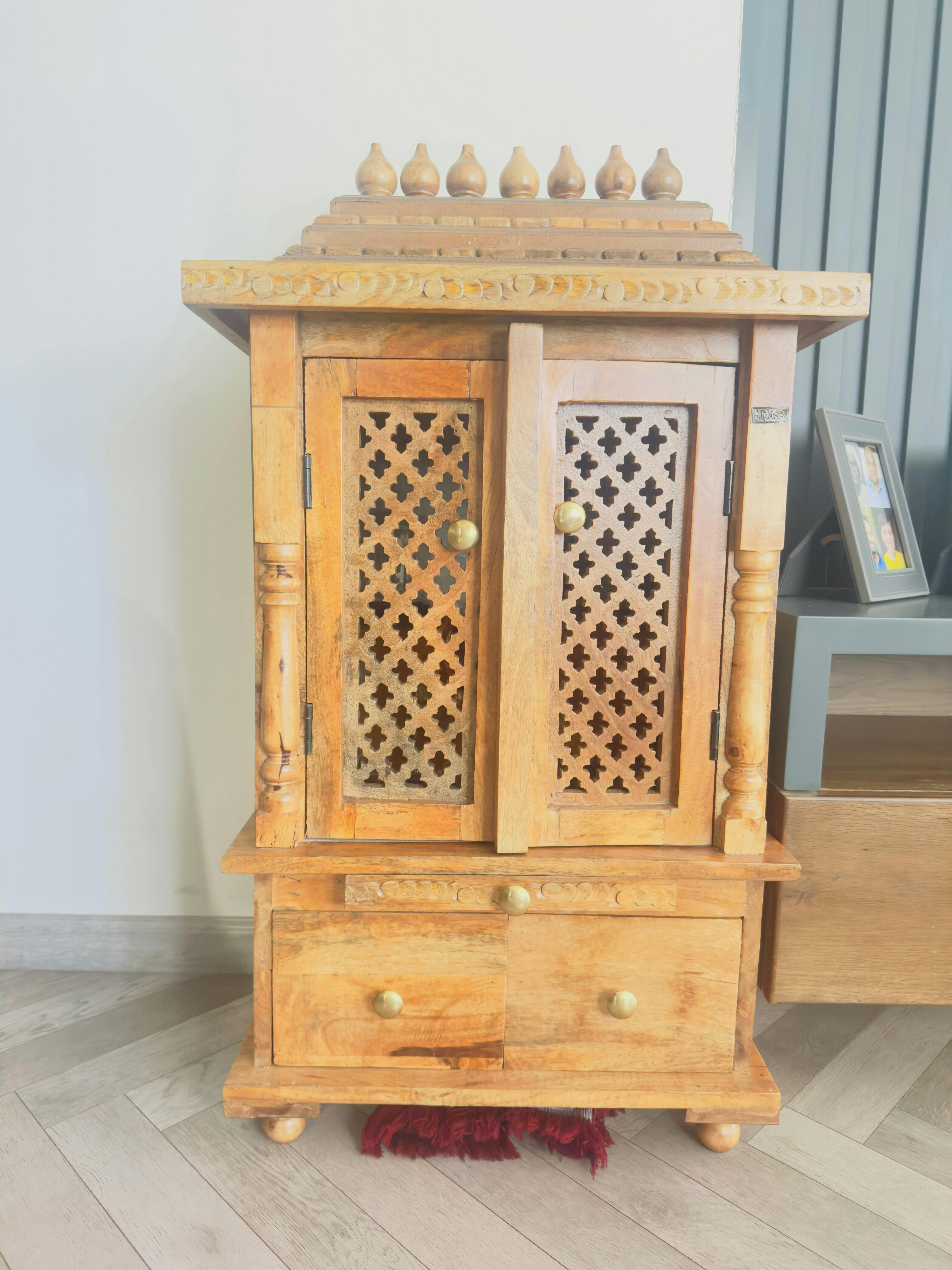 A nicely designed temple cum cabinet.. a bit pricey, but liked the curvings and style…